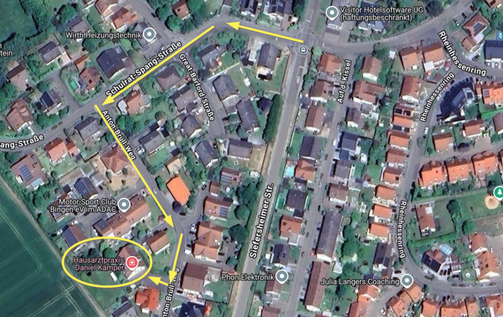 Bitte beachten Sie, dass die Anfahrt zur Praxis Wöllstein über die Schulrat-Spang-Straße in den Anton-Brüll-Weg führt. (siehe Darstellung in Gelb auf der Karte). Die Google Routenplanung gibt dies oft falsch wieder.